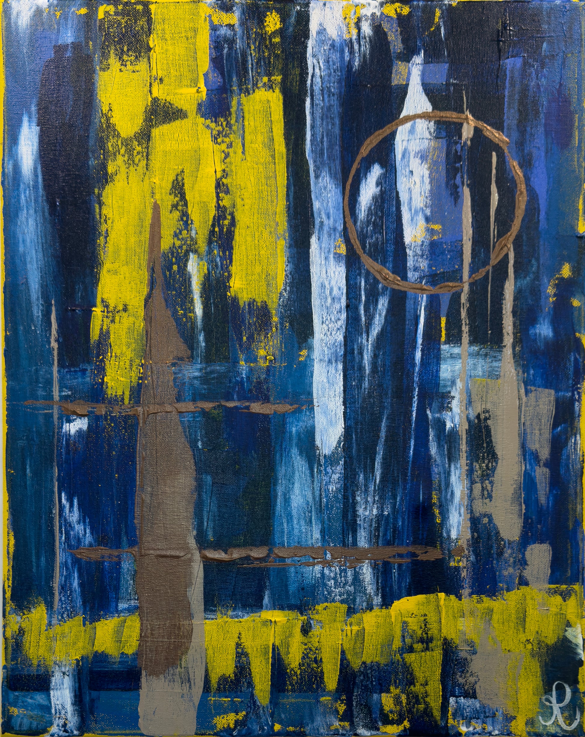 Inspired by the ancient myth of Helios, this painting depicts the sun’s journey through the dark expanse of the cosmos. The vertical strokes represent the "falling" of the night, while the golden ring is the sun itself—stubborn, bright, and eternal. It is a story of persistence: even when surrounded by the vast cold of the blue void, light finds a way to carve out its place and leave a glowing trail behind.