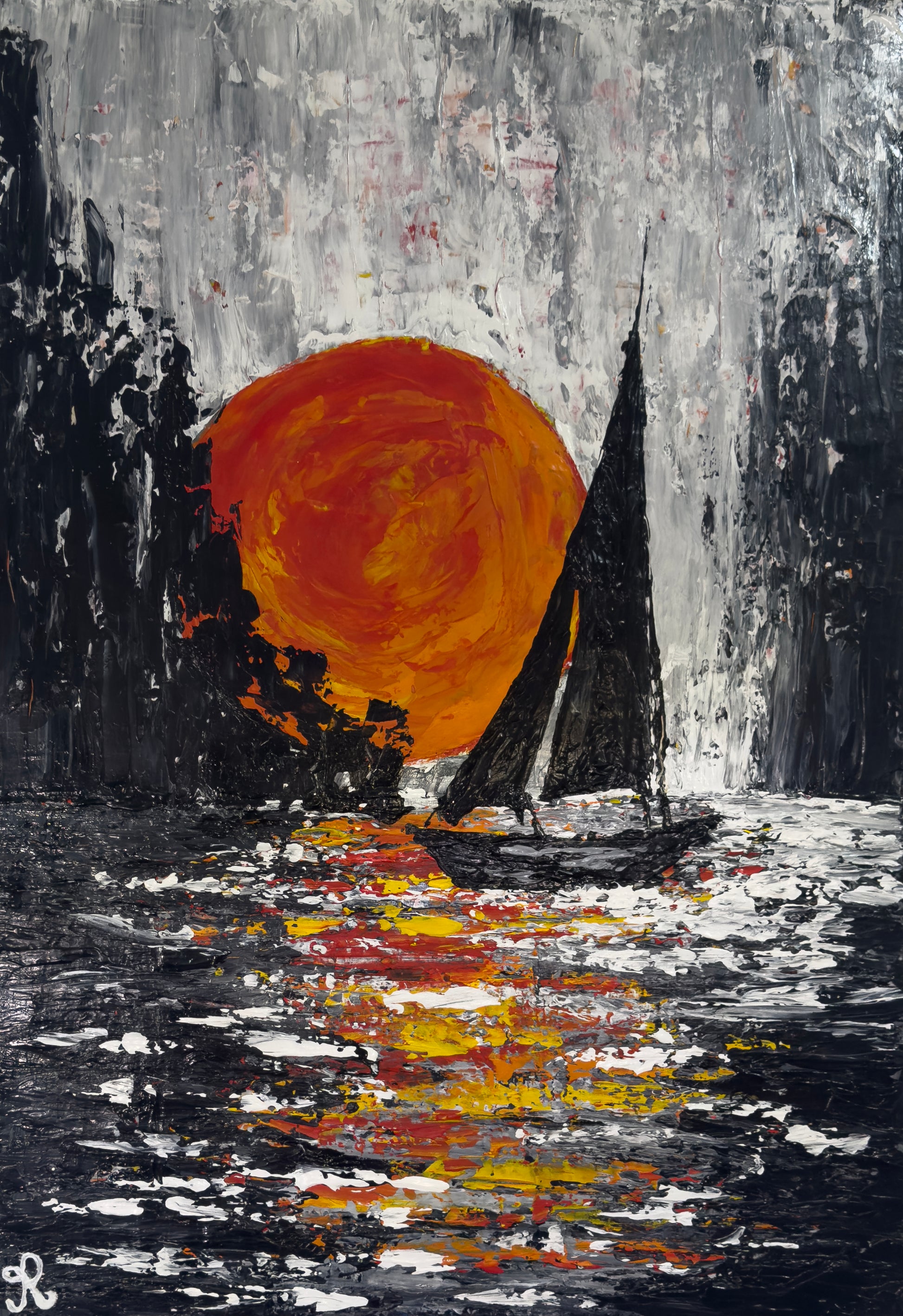 A dramatic, palette-knife painting featuring high-contrast colors and heavy texture. The scene depicts a sailboat at sunset, with the immense orange sun dominating the canvas. The dark, monochromatic background heightens the intensity of the sun's reflection, which fragments into bold strokes of red, yellow, and white across the agitated water.